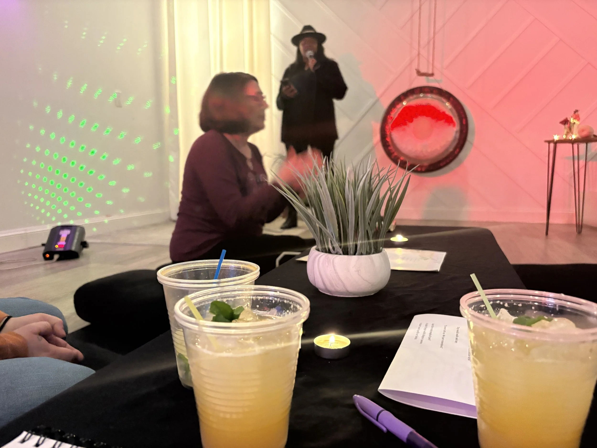 Vibe:Cozy, connected, and full of love—with mocktails & munchies/ dinner by Kind Juice Bar to sip while you soak it all in and share or simply listen.